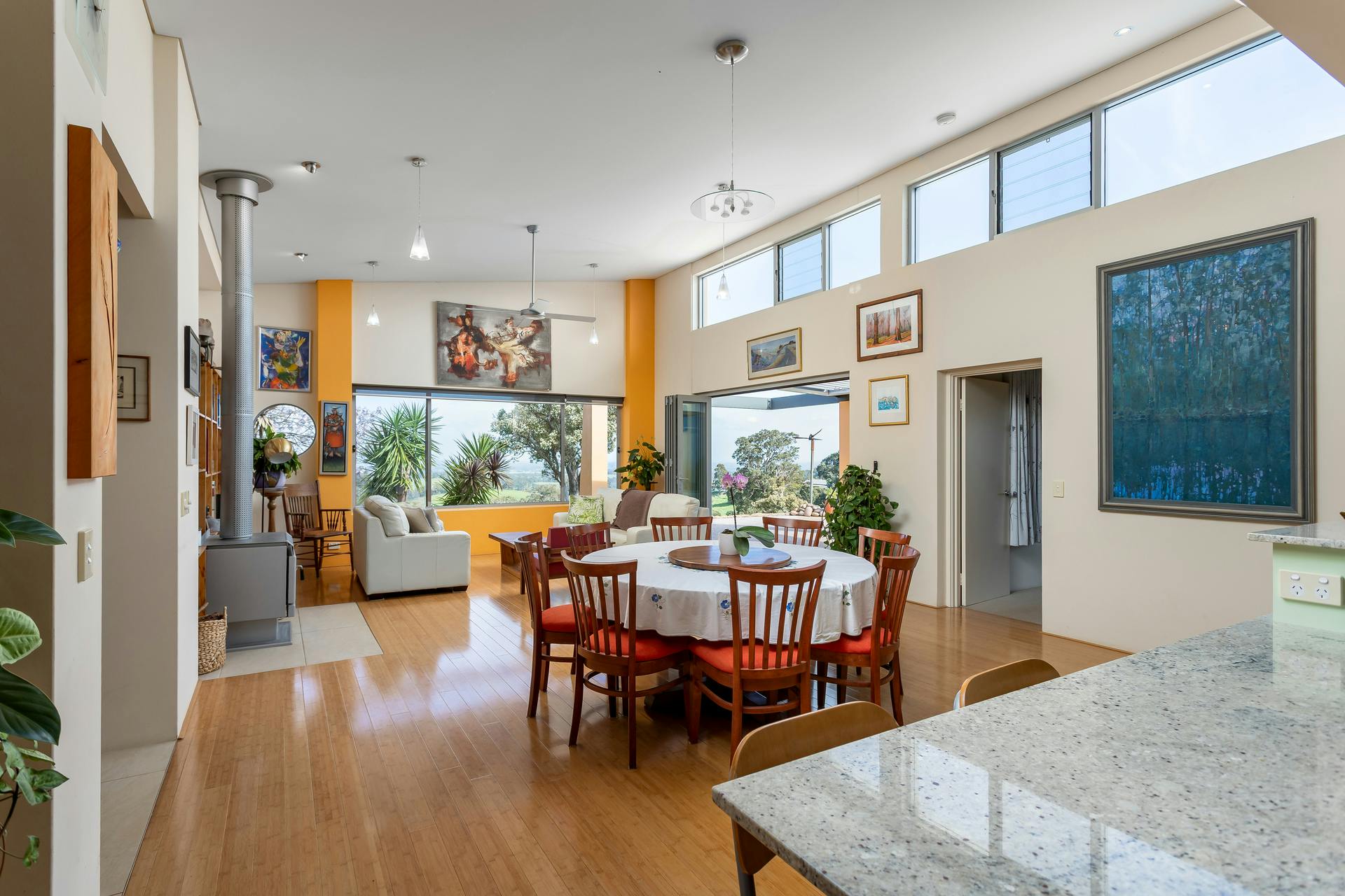 This one of a kind home invites you in, and you soon realise this is not your standard home, With the lounge area off to the right your eyes are drawn to the light filled room in front of you as you walk through into the open plan living the ceilings rise to the heavens and your eyes are drawn to the west where a full wall of glass draws your eyes to the most amazing panoramic views, now this is a feature you will never take for granted.