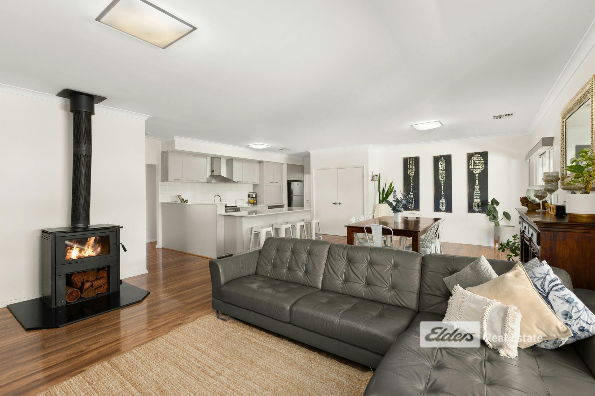Designed with generous proportions and multiple living zones, the layout caters effortlessly to everyday living and entertaining. The open-plan living and dining area forms the heart of the home, complemented by a wood fireplace that adds warmth, character and a cozy focal point during the cooler months.